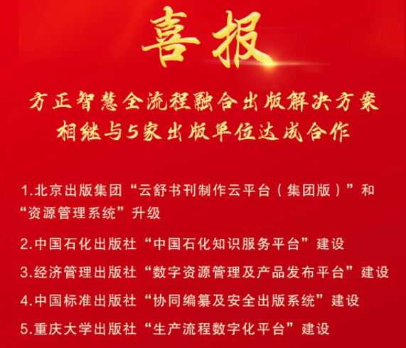 喜報 |“方正智慧全流程融合出版解決方案”相繼與5家出版單位達(dá)成合作!