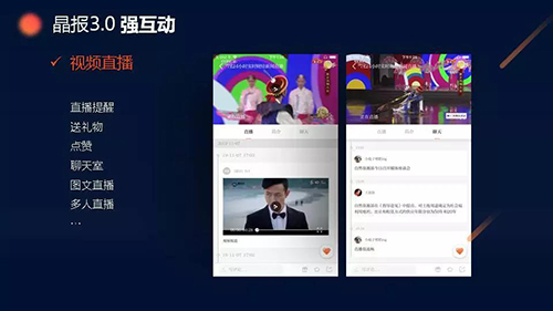 不僅如此,在“視頻直播”版塊,用戶可以邊看直播邊送禮物、點贊、進(jìn)入聊天室發(fā)表意見;在“問吧”、“投票”、“爆料”等版塊,用戶可以把疑問、意見建議和身邊大小事通過APP平臺發(fā)送給晶報,形成雙方互動等等。